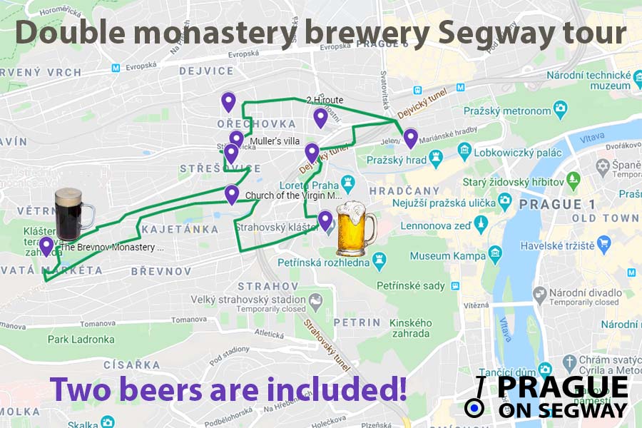 Ihre Tour beginnt mit einer kurzen Einweisung und einer Probefahrt auf dem Segway. Genießen Sie die Segway-Fahrt und besuchen Sie beide Klosterbrauereien, wo Sie traditionelles Bier genießen. Das erste Ziel ist das Kloster Břevnov, das älteste Kloster Tschechiens, gegründet 993. Hier sehen Sie die St.-Margareten-Kirche und die älteste Brautradition Böhmens. Anschließend erwartet Sie eine gemütliche Fahrt durch die Straßen von Alt-Stresovice, auch bekannt als das Beverly Hills der Stadt. Das zweite Ziel ist das Kloster Strahov, das höchstgelegene Kloster Tschechiens. Hier können Sie den atemberaubenden Panoramablick bewundern und preisgekrönte Biere probieren.
